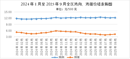 1-9月份,我区鸡肉价格稳中小幅波动,鸡蛋价格先降后升。其中,鸡肉市场供需整体平衡,价格月环比变动幅度在2.00%以内;今年以来蛋鸡存栏处于近年同期高位水平,鸡蛋市场供应压力较大,价格以降为主。9月份鸡蛋、鸡肉全区平均价格分别为每500克4.21元、12.17元,与年初相比,鸡肉价格略涨0.41%,鸡蛋价格下降21.01%。