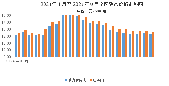 前三季度,猪带皮后腿肉、猪肋条肉全区平均价格分别为每500克12.71元、13.11元,同比,猪带皮后腿肉、猪肋条肉价格分别下降3.49%、3.60%。
