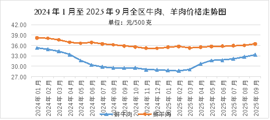 1-9月份,我区牛羊肉市场供应压力有所缓解,价格以涨为主。牛肉、去骨羊肉9月份全区平均零售价格分别为每500克33.30元、36.41元,与年初相比,牛肉、去骨羊肉价格分别上涨15.50%、2.68%。
