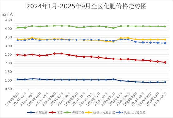 2025年前三季度我区监测的5种化肥平均价格为2.78元/千克,比去年同期下降3.57%。分品种来看,碳酸氢铵、尿素、磷酸二铵、氯基三元复合肥、硫基三元复合肥前三季度全区平均价格分别为0.95元/千克、2.18元/千克、4.13元/千克、3.26元/千克、3.37元/千克。与去年同期相比,磷酸二铵价格略涨0.40%,碳酸氢铵、尿素、氯基三元复合肥、硫基三元复合肥价格分别下降9.43%、12.00%、2.81%、0.76%。