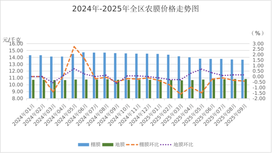 1-9月份全区棚膜、地膜平均价格分别为13.97元/千克、10.76元/千克,与2024年前三季度相比,棚膜价格下降3.34%,地膜价格略涨0.22%。