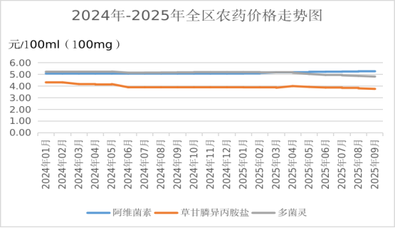 1-9月份阿维菌素、草甘膦异丙胺盐、多菌灵全区平均价格分别为5.21元/100ml、3.87元/100ml、5.04元/100克,与去年同期相比,阿维菌素价格略涨2.49%,草甘膦异丙胺盐、多菌灵价格分别下降5.06%、3.19%。