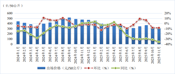 11月份,全区生猪平均出场价格为630.42元/50公斤,与10月份相比(以下简称环比)下降1.59%,较上月收窄7.19个百分点;与2024年11月份相比(以下简称同比)下降28.12%。从周监测情况看,11月5日、12日、19日、26日全区每50公斤生猪平均出场价格分别为639.25元、638.25元、626.00元、618.17元,呈现小幅下降态势。11月份,生猪市场供应仍处高位,需求有所走强,生猪市场交易氛围回暖,出场价格降幅收窄。