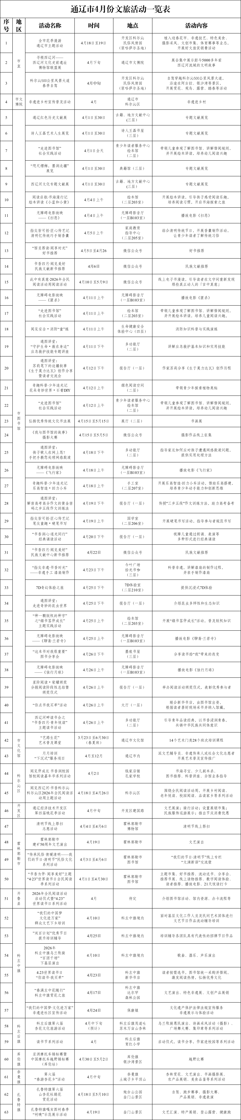 通辽市4月份文旅活动预告  四月的通辽已逐渐被花海温柔包裹从非遗市集到民俗展演一场场春日盛宴次第启幕通辽市4月份文旅活动一览表带你一站式解锁通辽春日限定浪漫赴一场花与民俗的美好之约通辽市花季漫游主题活动活动时间:4月中旬活动地点:科尔沁民俗风情园活动内容:迎春花市、特色美食摄影采风、文创市集等通辽市科尔沁500公里风景大道“踏春趣露营·自驾赏花季”春季自驾活动活动时间:4月中旬活动地点:科尔沁民俗风情园活动内容:自驾穿越科尔沁500公里风景大道沿途在阿古拉、银沙湾等景区开展赏花、观鸟、露营、踏春等活动通辽市文博院寻根西辽河·西辽河文化史前遗址博物馆联盟展活动时间:4月下旬活动地点:通辽市文博院活动内容:集中展示西辽河流域的文明故事通辽市文化馆“艺路生花”艺术普及课堂活动时间:4月1日-6月30日活动地点:通辽市文化馆活动内容:舞蹈、秧歌、合唱、书法等14个艺术门类28个班次培训课程通辽市图书馆4月份系列活动活动时间:4月份活动地点:通辽市图书馆活动内容:“指尖非遗·书香时光”漆扇制作活动“指尖皆可创·匠心传艺记”硬笔书写活动“指尖皆可创·匠心传艺记”手制香囊活动等科尔沁区“阅见西辽河·书香科尔沁”全民阅读活动周主题活动活动时间:4月18日-4月26日活动地点:科尔沁区活动内容:乡村阅读、老年阅读校园阅读、品读家乡等系列活动开发区第四届桃花季活动活动时间:4月中旬活动地点:开发区建国路活动内容:桃花主题骑行活动非遗文创、特色农产品展销市集夜间民族服饰巡游展示等霍林郭勒市建矿50周年文艺演出活动时间:4月19日活动地点:待定活动内容:文艺演出霍林郭勒市“传承民俗·情暖清明”清明节民俗活动活动时间:4月3日-6日活动地点:霍林郭勒市图书馆活动内容:开展清明主题图书推荐经典诵读及文明祭扫宣传活动开鲁县全民阅读活动启动仪式暨“4.23”世界读书日系列活动活动时间:4月中下旬活动地点:待定活动内容:介绍图书馆活动馆内资源、办卡流程等科左中旗“春满左中花随行”赏花之旅活动时间:4月17日活动地点:科左中旗达尔罕森林公园活动内容:文艺演出特色非遗展、文创产品展销等科左后旗第六届杏花文化旅游活动活动时间:4月中下旬活动地点:科左后旗茂道吐苏木万亩山杏林活动内容:文艺演出,非遗展,摄影大赛短视频大赛,广场舞比赛,诗画采风集印章活动,文化旅游宣传等库伦旗亚洲摩托车锦标赛暨中国摩托车越野锦标赛活动时间:4月30日-5月2日活动地点:库伦旗银沙湾景区活动内容:越野比赛奈曼旗第六届“春游杏花乡”活动活动时间:4月中旬活动地点:奈曼旗土城子乡平顶山活动内容:杏林赏花、文艺演出书画摄影展、农产品展销、美食品鉴等扎鲁特旗第六届“山杏花杜鹃花”赏花活动活动时间:4月18日-5月10日活动地点:扎鲁特旗金门山景区活动内容:赏花自驾、徒步线路发布10公里健康跑、20公里自行车骑游等赛事四季摄影大赛开幕、农产品展销乌力格尔、好来宝等非遗项目展演还有众多系列活动见下表个别活动时间地点尚未确定详情请关注各旗县官方公众号哦~四月的通辽藏着最温柔的春色与最浓郁的民俗风情收好这份活动一览表约上家人朋友一起奔赴这场春日花事在通辽的花海里邂逅不期而遇的美好吧!