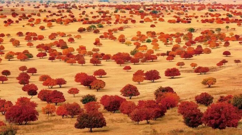 十月上旬,科右中旗代钦塔拉的五角枫进入最佳观赏期。漫山遍野的枫叶由绿转黄、由黄变红,层层叠叠,如火似霞。沿着木栈道缓缓而上,脚下落叶沙沙作响,山顶视野开阔,本地人建议:清晨或傍晚光线最柔和,穿浅色衣服更出片;