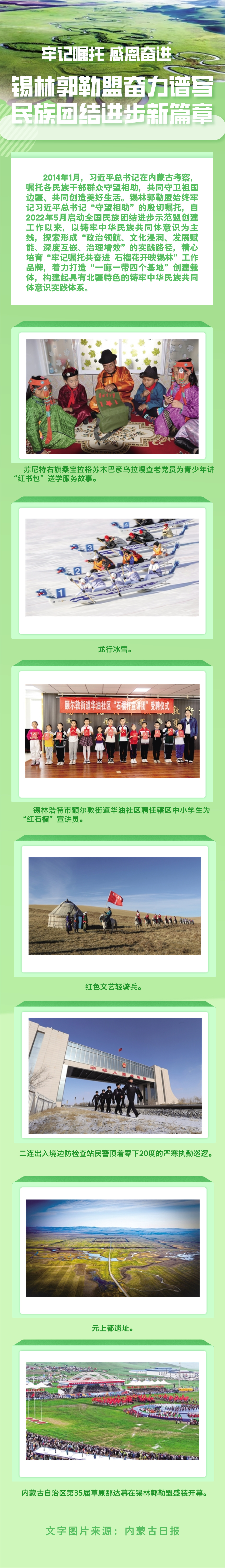 征程万里风正劲,重任千钧再出发。锡林郭勒盟将始终牢记初心使命,把民族团结的宝贵经验转化为前行动力,在铸牢中华民族共同体意识的道路上勇毅前行,为祖国北疆建设得更加繁荣稳定作出新的更大贡献。
