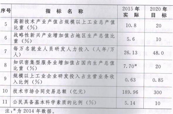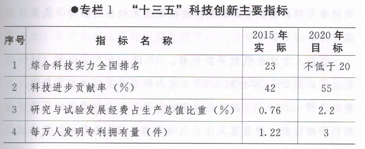 综合科技实力进入全国中等水平。到2020年,科技进步贡献率达到55%,全社会研究与试验发展(R&D)经费占生产总值比重达到2.2%,每万人发明专利拥有量达到3件,技术市场合同交易总额达到300亿元,创新装备条件大幅度改善,自主创新领域不断拓宽,综合科技实力在全国的排位进入前20位。