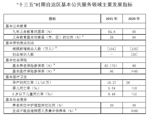 自治区党委、政府高度重视民生工作,“十二五”时期各级财政累计投入民生资金1.18万亿元,是“十一五”时期的2.6倍,初步建立起与区情财力相适应,并随经济社会发展动态调整的、可持续的基本公共服务体系,基本公共服务水平和均等化程度明显提高。