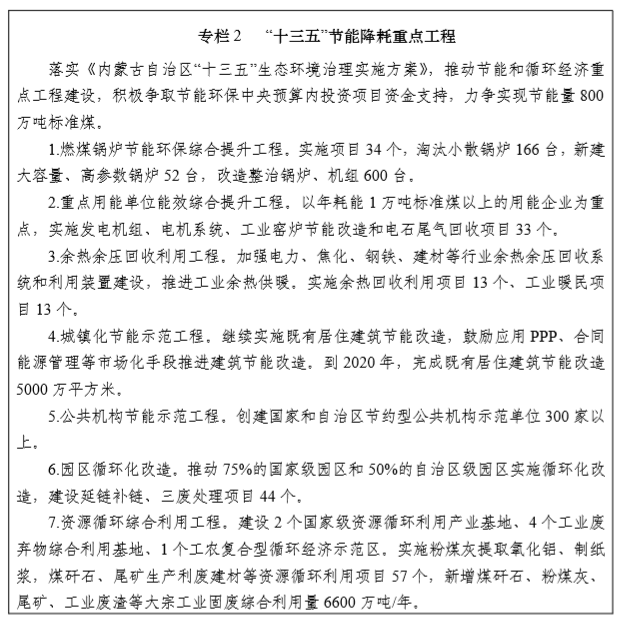 大力推进二氧化硫、氮氧化物、烟粉尘等多污染物协同控制治理。以燃煤机组超低排放改造为重点,对电力、钢铁、有色、建材、石化、焦化、化工等重点行业实施综合治理。自2016年起,有条件的新建燃煤发电机组全部达到超低排放要求。在乌海及周边地区通过主要污染物排放总量控制及特别排放限值、行业规划环评、区域污染联防联控等手段,保障区域性多种大气污染物的协同控制,实现区域环境质量明显好转;在呼包鄂地区进行区域布局调整、结构优化、产业升级,加快实现绿色转型;在通辽北部地区通过建设煤电铝烟气污染物趋零排放示范工程等措施进行氟化物污染控制。
