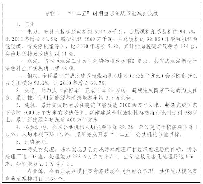 十二五时期,自治区党委政府高度重视节能减排工作,认真贯彻落实党中央、国务院节能减排决策部署,坚持节约优先、保护优先、自然恢复为主的方针,以强有力的措施推进节能减排,顺利完成了十二五节能减排目标任务,有力地推进了经济转型升级提质,为实现自治区可持续发展奠定了良好基础。