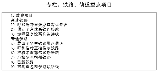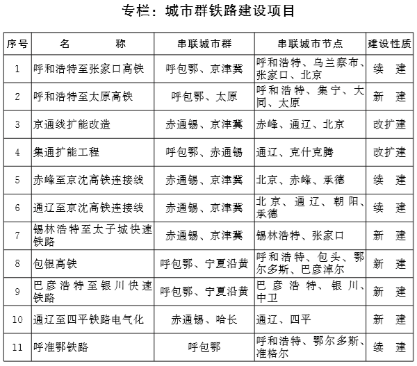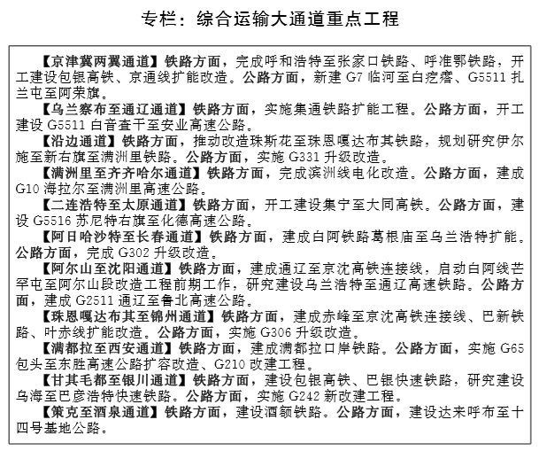 着力强化乌兰察布至通辽通道。支撑自治区城镇体系建设, 密切衔接呼包鄂城市群、赤通锡城镇化片区,加快完善快速城际交通网,强化蒙东、蒙西核心区的联系。