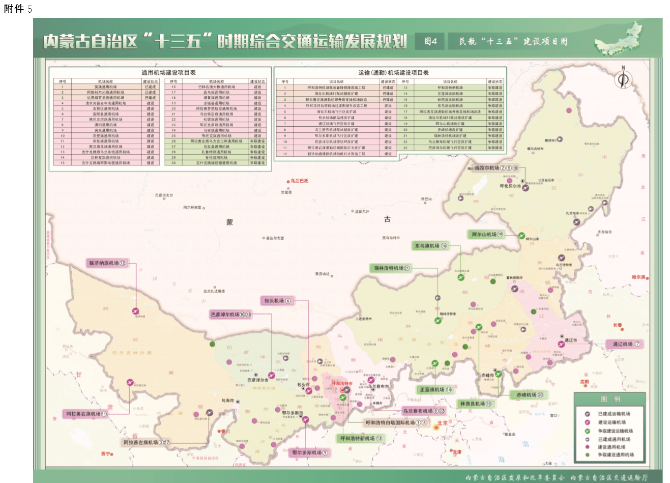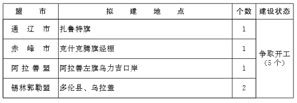 推动呼和浩特新机场项目建设。积极推进正蓝旗、林西县、 东乌珠穆沁旗3个运输机场新建工程和阿拉善左旗通勤机场升级支线机场建设项目。努力推动海拉尔、包头、通辽、锡林浩特、 乌兰察布、鄂尔多斯、巴彦淖尔、赤峰、阿尔山、乌海等机场改扩建和阿拉善右旗、额济纳旗通勤机场改造工程,完善机场基础设施,提升运输机场保障能力。加快推进通用机场布点规划与建设,“十三五”期间建成25个通用机场,初步形成以海拉尔机场为中心的东北部通用机场群、以锡林浩特和赤峰机场为中心的东南部通用机场群、以鄂尔多斯机场为中心的西南部通用机场群、 以阿拉善左旗机场为中心的西部通用机场群。