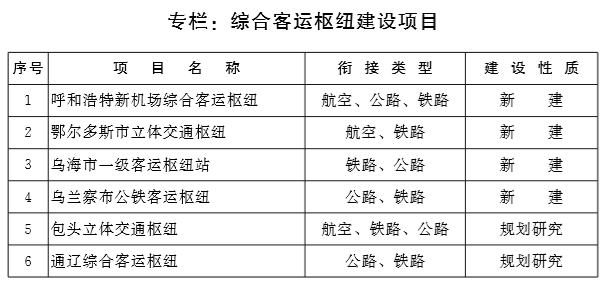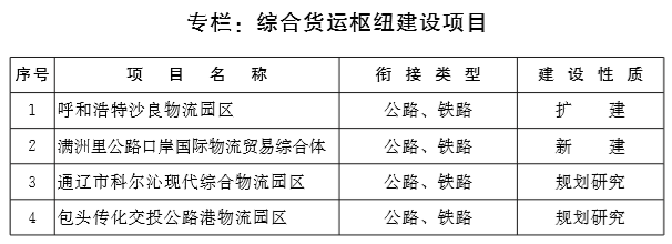 加快综合交通枢纽建设。完善综合交通枢纽布局,建设呼和浩特新机场等4个综合客运枢纽,加快包头市立体综合交通枢纽、通辽市综合交通枢纽规划研究。建设呼和浩特沙良物流园区等2个综合货运枢纽,加快包头传化交投公路港物流园区、通辽市科尔沁现代综合物流园区规划研究。