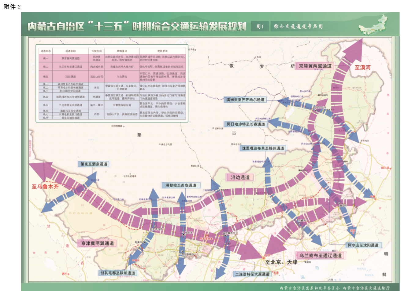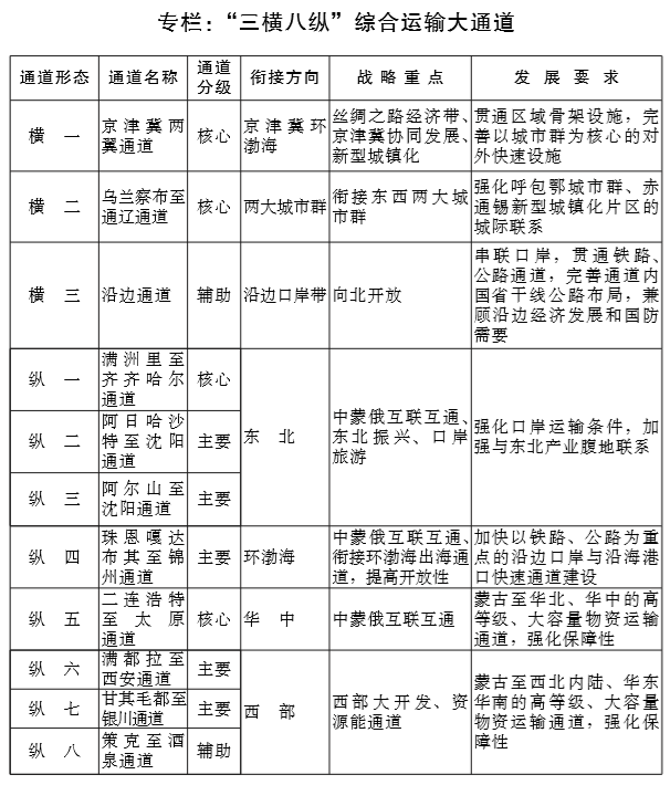 综合运输通道。培育构筑综合运输大通道,增强通道功能, 提高保障通过能力,重点建设衔接主要城市节点的京津冀两翼、乌兰察布至通辽通道,服务核心口岸的满洲里至齐齐哈尔、二连 浩特至太原通道;加快建设满洲里至巴彦淖尔 (沿边)、阿日哈沙特至长春、阿尔山至沈阳、珠恩嘎达布其至锦州、满都拉至西安、甘其毛都至银川、策克至酒泉通道。到2020年,基本形成 内部衔接通畅,对外沟通完善的 “三横八纵”综合运输大通道。