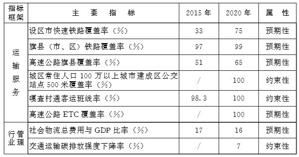交通科技信息化水平显著提升,实现出行信息服务 “一网通”、物流信息服务 “一站通”、重点城市群内 “交通一卡通”互联互通,联网电子不停车收费 ( ETC)基本覆盖全区高速公路, 并实现与周边省 (区、市)联网。交通装备和交通运行对外部资源环境更加友好。到2020年,交通碳排放较2015年下降7%。