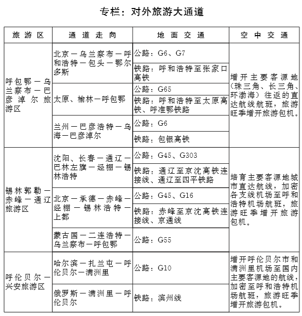 构筑服务于四大旅游区客源进出的对外通道。形成以高速公路、快速铁路地面交通为主的九大旅游进出大通道,主要服务800公里以内客源进出;加快旅游区机场工程建设、提升机场运力、增开主要客源地往返直达航线航班、旅游旺季增开旅游包机等,加快构建空中交通走廊,服务800公里以上客源进出。