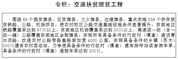 畅通贫困地区骨干通道。以革命老区、集中连片特困地区、 边疆地区和国贫、区贫旗县为重点,加强旗县 (市、区)至盟市间高等级公路建设,实施具有对外连接功能的重要干线公路提质升级工程,加快推动既有县乡公路提级改造,增强县乡中心区域的辐射带动能力。提高贫困地区公路通达通畅深度,有序推进贫困地区所有具备条件的乡镇、建制村、撤并村及一定人口规模的自然村通硬化路。加快资源丰富和人口相对密集贫困地区的开发性铁路建设,围绕边远贫困地区和贫困地区中的旅游资源集中区完善支线和通用机场建设布局。