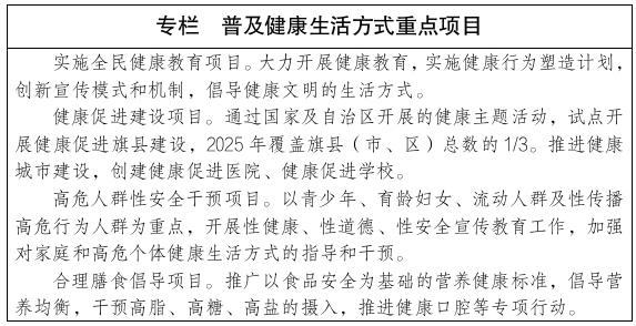 推广普及健康生活,倡导树立科学的健康观,营造健康文化,塑造自主自律的健康行为,以提高居民健康素养为核心,全面加强健康促进与教育工作。建立全面覆盖、分工明确、功能完善、运转高效的健康促进与教育体系。全面推进健康教育专业机构建设,加强健康教育队伍服务能力,完善健康教育工作机制,健全健康影响因素监测与评价体系。创新健康教育模式方式,科学普及健康知识,做好健康信息发布,深入开展全民健康素养促进行动,提高健康教育的针对性、精准性和实效性,提升健康教育工作水平。