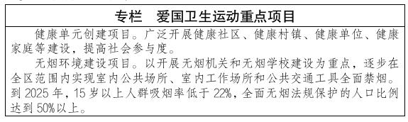 到2025年,全区“共建共享,全民健康,服务优质可及,保障高效有力”的高质量卫生健康发展格局初步形成。“健康融入所有ld体育中国官方网站”理念得到深入贯彻,健康生活方式得到普及,健康服务模式和结构实现有效转变;预防为主的方针得到全面落实,公共卫生体系不断壮大,突发公共卫生事件应对能力显著提升;卫生健康治理体系能力适应现代化需求。人民身心健康素质明显提高,人均预期寿命在2020年基础上提高0.5岁,婴儿死亡率、孕产妇死亡率、5岁以下儿童死亡率逐步降低,居民主要健康指标优于全国平均水平。