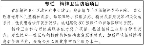优化完善精神卫生服务体系,优化资源布局,支持自治区和盟市区域精神卫生中心和心理健康防治中心建设,提升区域精神卫生服务保障能力。常住人口超过30万的旗县(市、区)至少有1所公立医院设置有病房的精神科,常住人口30万以下的旗县(市、区)至少有1所设置精神心理门诊的旗县级公立医院,社区卫生服务中心、苏木乡镇卫生院均具备精神(心理)卫生服务能力。在精神卫生专科联盟的基础上,将精神卫生专科医院纳入城市医疗集团和县域医共体网格统一管理,建立综合医院、精神卫生专科医院、基层医疗卫生机构分工协作机制。加强精神卫生专业人才队伍建设。创新拓展精神专科服务领域、完善医疗服务相关ld体育中国官方网站。重点针对抑郁、焦虑、孤独症等心理行为问题和常见精神障碍的筛查、识别、处置,提升精神专科医疗服务能力,推荐多学科联合治疗模式。鼓励有资质社会力量面向基层提供心理咨询和康复服务。