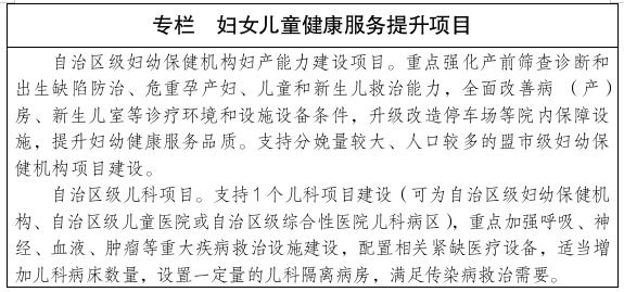 全面改善妇幼机构基础设施条件。支持妇幼保健机构、医院妇产科建设,提升产前筛查和出生缺陷防治、危重孕产妇救治与新生儿救治能力,增加产科床位,全面改善病(产)房、新生儿室等诊疗环境和设施设备条件。到2025年,实现建好一所高水平自治区级儿童医院,盟市建好一个综合医院儿科病区目标,全面提升旗县级儿科服务能力。升级改造高品质、普惠性产床和儿科床位,改善“一床难求”、环境拥挤、空间狭小的现状,缓解儿童看病就医难的问题,保障妇女儿童健康目标如期实现。