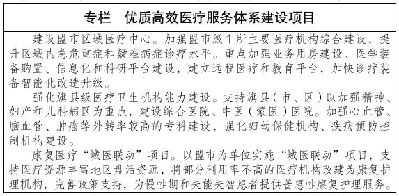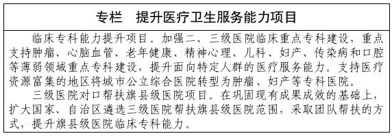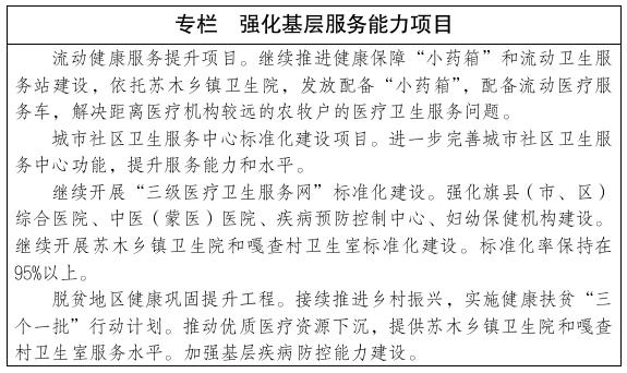 开展医院服务能力建设,加强自治区级医教研龙头医院、盟市区域医疗中心和专科医院建设。进一步提升自治区和盟市综合医院、中医(蒙医)医院、妇幼保健院服务能力,加快推进卒中、急救、创伤和胸痛中心建设,提升儿童、重症医学、母婴危重救治、精神疾病和康复等方面的服务水平。开展基层卫生服务能力建设,强化优质服务,推动苏木乡镇卫生院和社区卫生服务中心达到国家“优质服务基层行”标准要求,扶持其开展特殊科室建设。