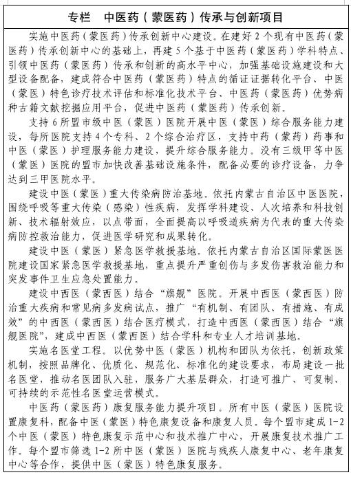 加强以中医(蒙医)特色优势重点专科专病为基础的相关业务用房建设,优化功能布局,改善诊疗环境,强化设施设备配置。加强中医(蒙医)临床研究基地和科研机构建设,保护传统知识。推进中医(蒙医)标准化建设工作。推进中医(蒙医)全科医师和住院医师规范化培训基地建设。加快中医药(蒙医药)科技进步,推广中医药(蒙医药)标准和适宜技术,加强各类各层次中医药(蒙医药)人才培养。总结优势病种诊疗方案和临床路径并在全区推广使用,名老中医(蒙医)传承工作室培养一批传承名医经验、掌握传统思维、诊疗技术强的中医药(蒙医药)骨干力量。