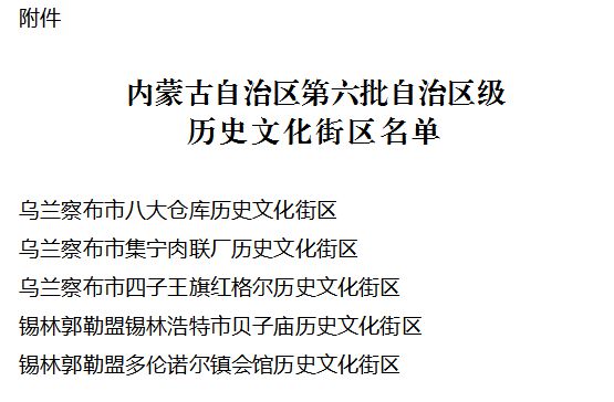 为了更好地保护我区优秀历史文化遗存,完善历史文化遗产保护体系,自治区人民政府确定乌兰察布市八大仓库等5条历史文化街区为第六批自治区级历史文化街区,现予公布。