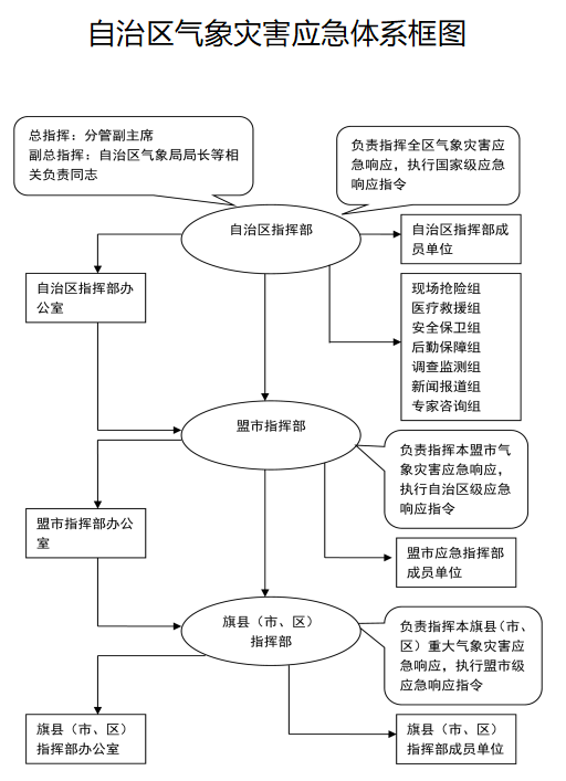 自治区人民政府成立自治区人工影响天气与气象灾害防御指挥部(以下简称“自治区指挥部”),统一领导和指挥气象灾害监测、预报预警、分析研判和应急处置工作。总指挥由自治区政府分管副主席担任,内蒙古气象局局长等相关负责同志担任副总指挥。