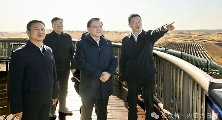10月28日,自治区党委书记王伟中走进鄂尔多斯“沙戈荒”中北部新能源大基地,认真了解“光伏长城”项目建设和防沙治沙进展情况。草原云·内蒙古新闻网记者 马建兵 摄