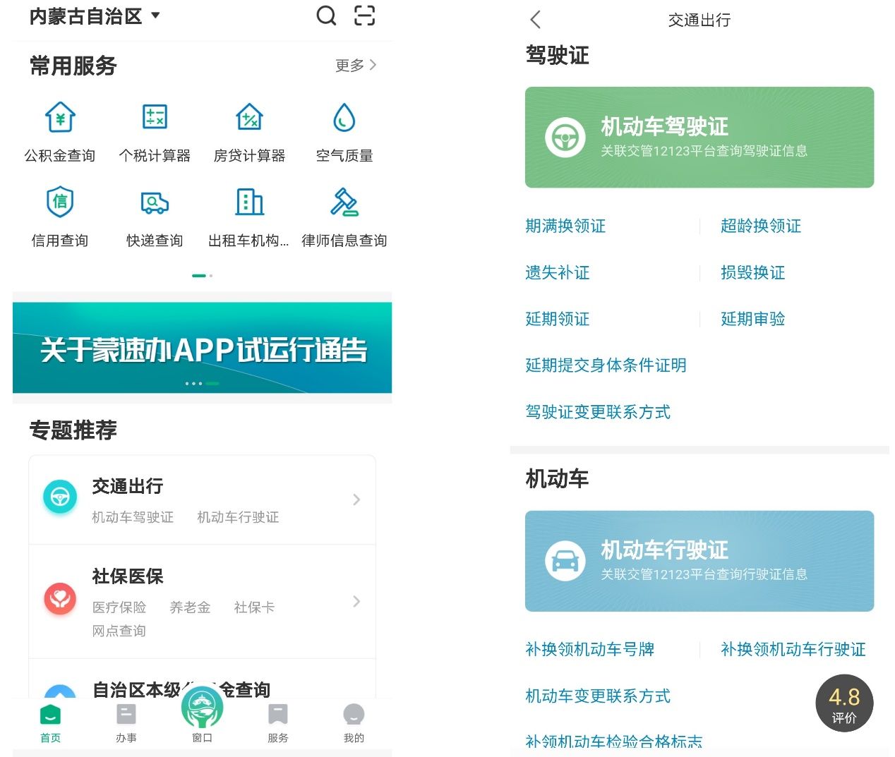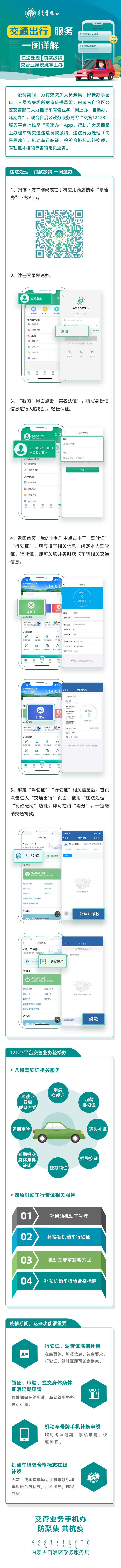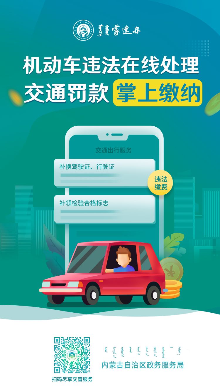 疫情期间,为有效减少人员聚集,降低办事窗口、人员密集场所病毒传播风险,内蒙古自治区公安交管部门大力推行车驾管业务“网上办、自助办,延期办”,联合自治区政务服务局将“交管12123”服务平台上线至“蒙速办”App,帮助广大居民掌上办理车辆交通违法罚款缴纳、违法行为处理(简易程序),机动车行驶证、检验合格标志补换领,驾驶证补换领等各项常见业务。